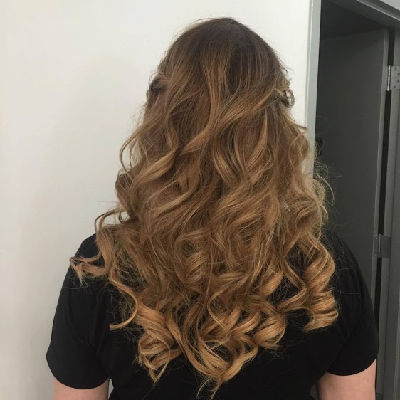 A person with long, wavy, light brown hair seen from the back, wearing a black shirt and showcasing one of the latest hair styles, stands indoors near a grey door.